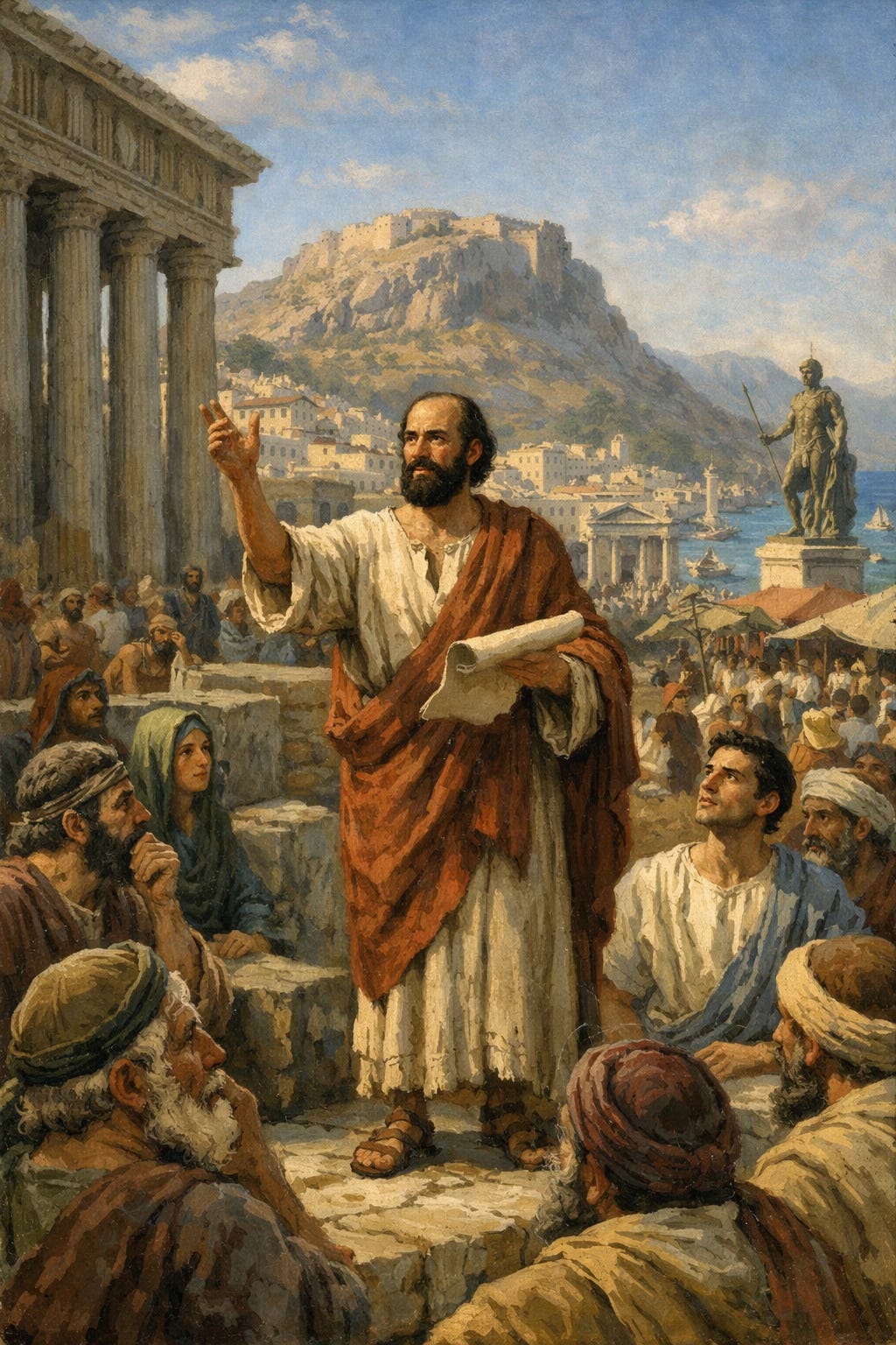 Towering above was the Acrocorinth, an acropolis with views of the Gulf of Corinth. It served for defense and pagan worship, large enough to shelter the entire city during a siege. It housed a temple to Aphrodite, goddess of love, with about 1,000 priestesses who were ritual prostitutes. Each night, they descended into the city to “serve” travelers and locals, making “to Corinthianize” a synonym for a loose, drunken lifestyle.